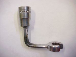 This tool is a custom-shaped wrench for removing the oil line going to the distributor. I started with a 3/8″ flare nut wrench. I shortened the handle and then bent it 90 degrees. Tool steel is impossible to bend cold, so I heated the handle cherry red with a cutting torch first. After the wrench cooled I glued the handle stub into an old 3/8″ drive socket with more J-B Weld epoxy. - Tool #3: Oil Seal Remover