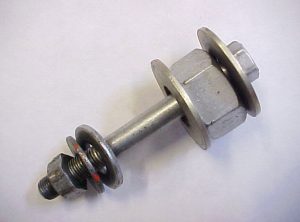 This tool is a long bolt with several nuts and washers for pulling a distributor mainshaft oil seal into place. The large nut acts as a slip collar to protect the top of the distributor while the bolt and small nut are turned with wrenches.