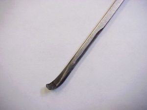 The distributor oil seal remover is just a screwdriver shaft with a reshaped blade. With it you can drive out oil seals from the backside. I made mine by using a Dremel tool with a cutoff wheel as a grinder. I removed the screwdriver handle because it was too soft to hammer, and then bent and recontoured the shaft tip so it would push squarely on the seal metal lip.